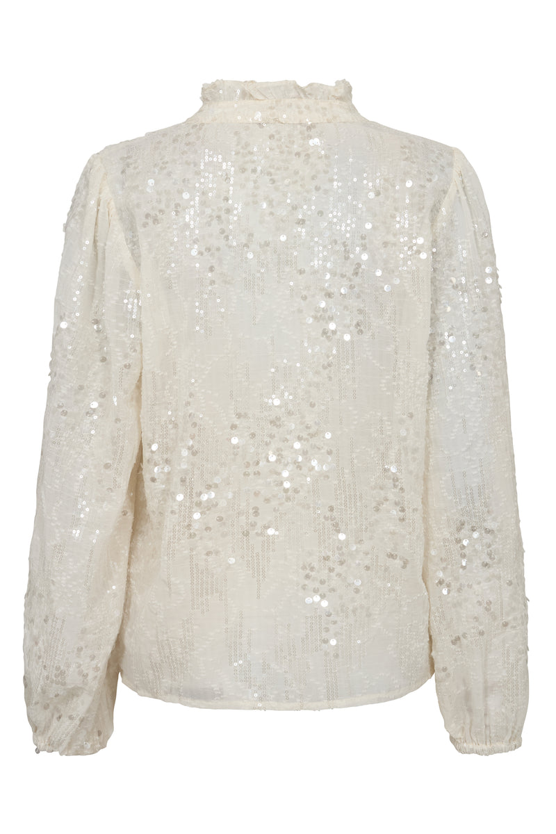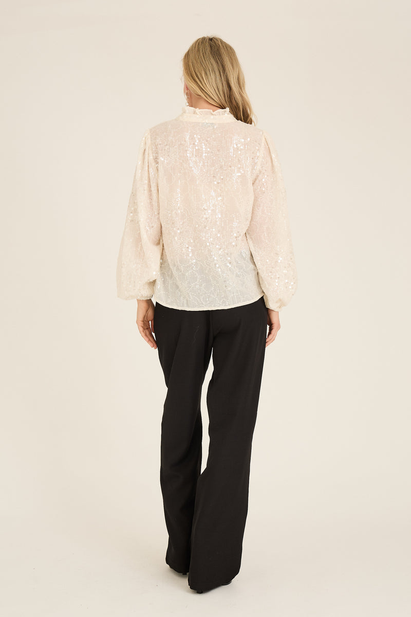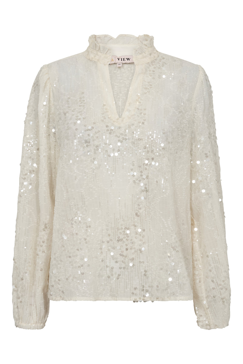 Grete Sequin Blouse er en let og festlig bluse dækket af pailletter. Den har V-udskæring, lange ærmer med elastik ved håndleddet og en afslappet pasform.